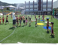 夏場は暑くなるだろうと思っていましたが、保育者のアイデアで、ホースの噴水を使って水を散水したら、プール遊びの前に子ども達が水着姿で、ゴロゴロ転がって水に打たれながら遊ぶようになりました。この遊びもすごくみんなが楽しがって、今ではプール前の準備運動がこの遊びでバッチリです。おかげで真夏の炎天下での活用もできるようになりました。