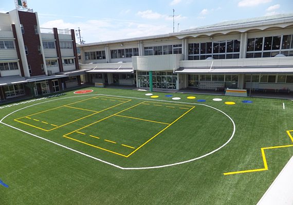 「相撲の土俵」「長いけんけんぱ」「ジグザグライン」などカラー人工芝による遊具がいっぱい。かけっこやボール遊びはもちろん、いろんな遊びが思いっきり楽しめる多目的な園庭になりました。
