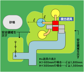 標準的な範囲は、落下高さが600mmを超える場合、遊具の外形から全ての方向に1,800mm以上確保することとし、600mm以下の場合は、その範囲を1,500mm以上とします。